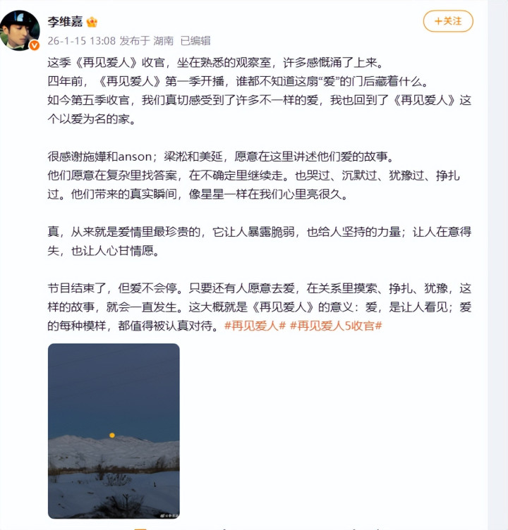 近期《相遇爱东说念主》收官,李维嘉在外交平台发长宣布别,字里行间尽是对心绪的叹息与独处孤身一人。