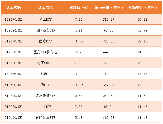 与此同期,主题和行业ETF份额大幅加多,比如近期反内卷代表化工,AI的非常是电力的电网树立,均赢得资金合手续加码,精通数据如下: