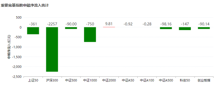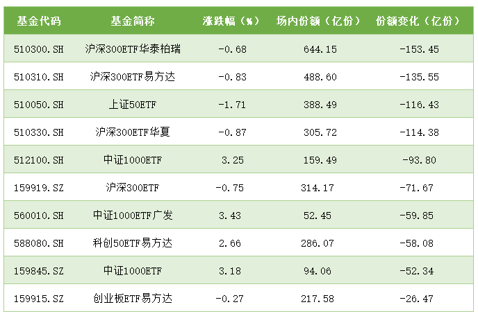 遗弃周五收盘,各大宽基指数涨跌互现,大户通过ETF调控市集的成果彰着,资金大幅流出的沪深300ETF、上证50ETF等大盘蓝筹指数小幅下落,而中证500、中证2000等中小盘宽基全线高涨,精通数据如下: