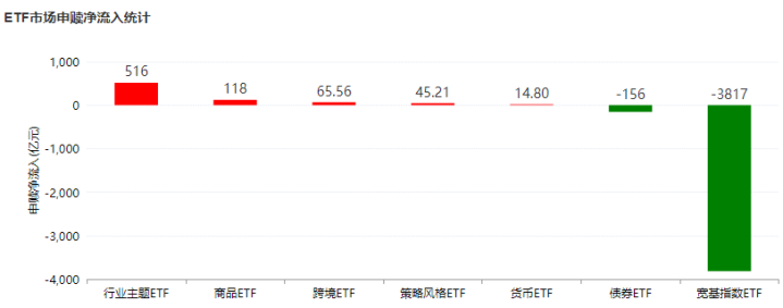 磋议词,智谋的资金别具肺肠,你卖你的大蓝筹,我买我的热门题材,互不影响。这就导致了ETF市集的南北极分化,宽基ETF资金大幅流出3817亿元,而行业主题ETF合手续吸金516亿元的昂然。