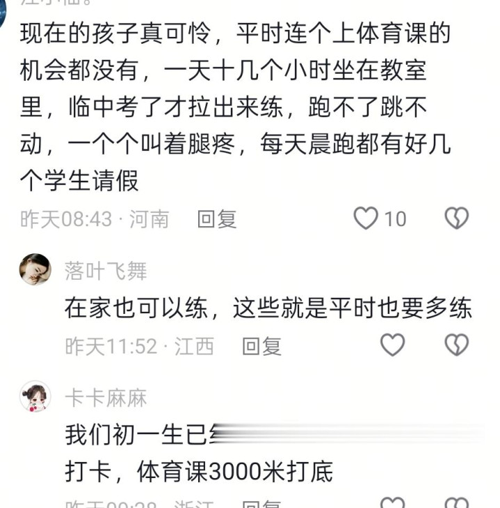 有东说念主详确孩子:当今的孩子真轸恤,浅近一天十几个小时坐在教室里,临中考了才拉出来练,跑不了跳不动,一个个喊着腿疼,晨跑皆有好多学生请假”