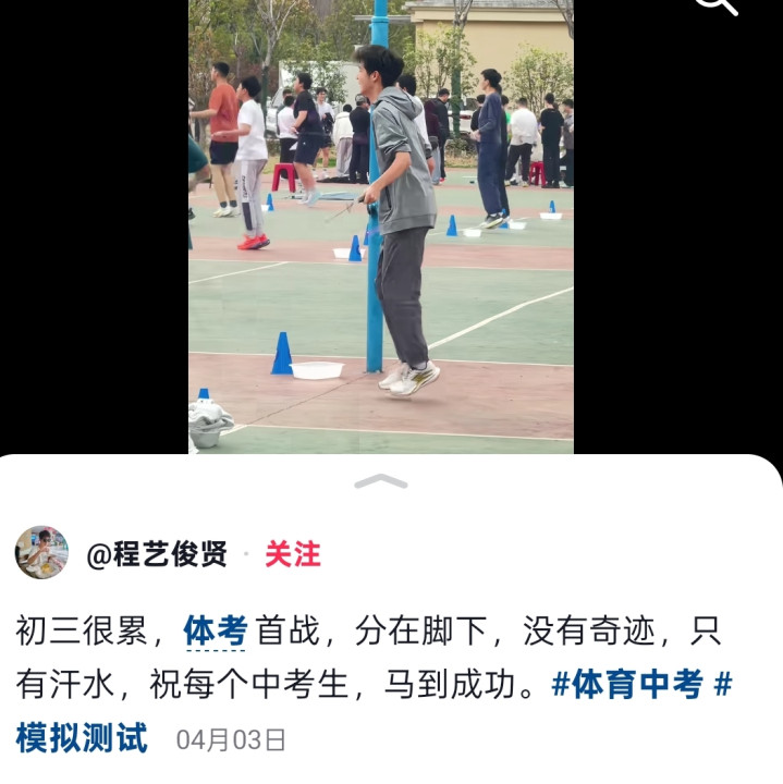 刷到一条中考体考跳绳的视频,操场上全是初三学生在拚命跳绳,镜头里穿灰衣服的男生,脚离地了,绳索甩得快出残影