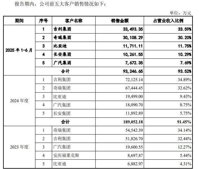 2022年至2024年,吉利集团销售额达7.43亿元、5.18亿元、7.21亿元,占比分别为53.1%、32.44%、34.89%。而奇瑞集团销售额为2.67亿元、5.45亿元、6.74亿元,占比为19.07%、34.14%、32.16%。