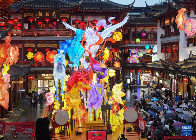 1月26日,在豫园商城中心广场上,旅客在马年主题灯组“骏驰九囿,步步生花”前藏身。1月26日晚,以“以梦为马,野外生花”为主题的2026上海豫园风气艺术灯会持重亮灯,开启为期36天的海派年味视觉盛宴。新华社记者刘颖摄