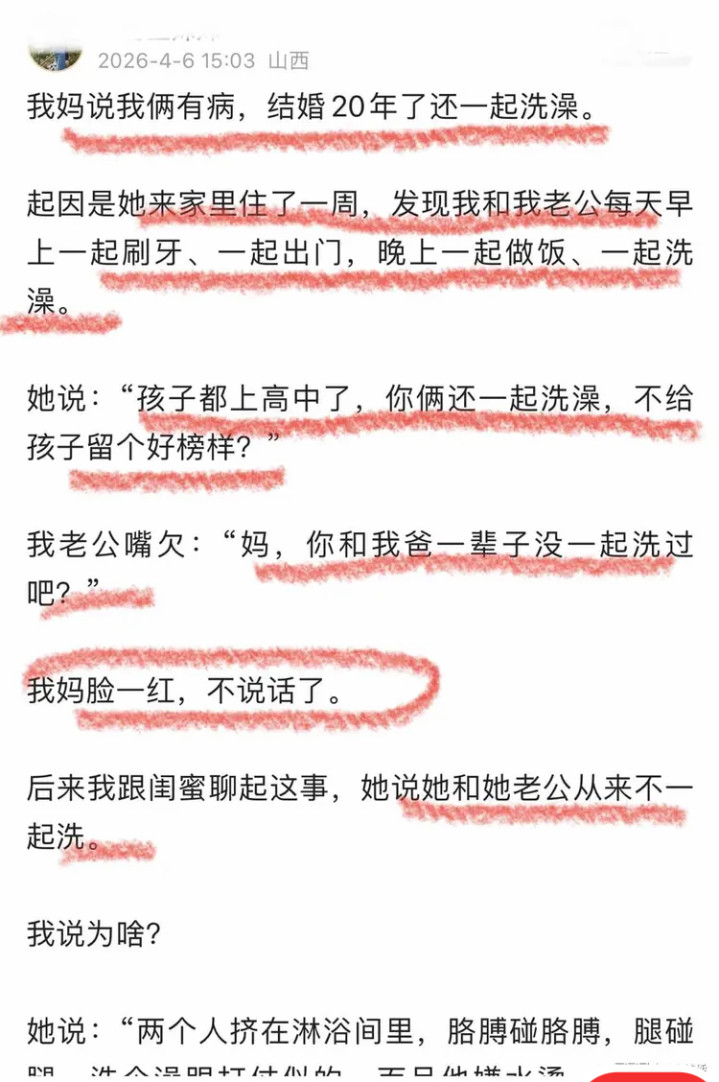 点个温煦不迷途。小编就和全球一王人聊聊山西一女子发帖:佳偶成婚20年一王人洗澡被母亲叱咤有病一事。