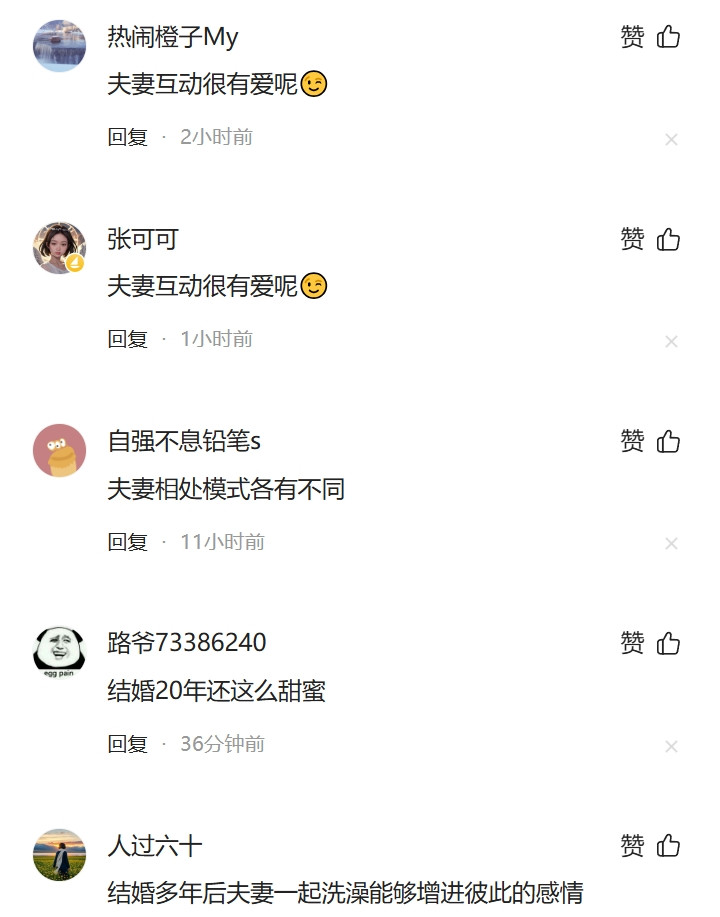 有网友说,网上晒成婚几十年的还一个被窝的挺多,然则天天一王人洗澡的真头一次别传你们俩上班放工休眠起床外出酬酢啥的时候这样一致吗节拍这样同频吗?