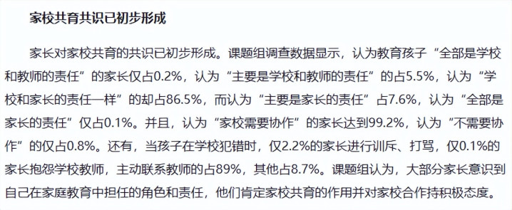 干系词事实上,绝大多数家长并莫得推卸掉属于我方的教导背负。在一项访问中,有86.5%的家长觉得“我方和学校应该共同承担教导”,独一0.2%的东说念主觉得教导应彻底交由学校。这评释,大部分家长关于孩子的教导并不是念念当罢休掌柜的。