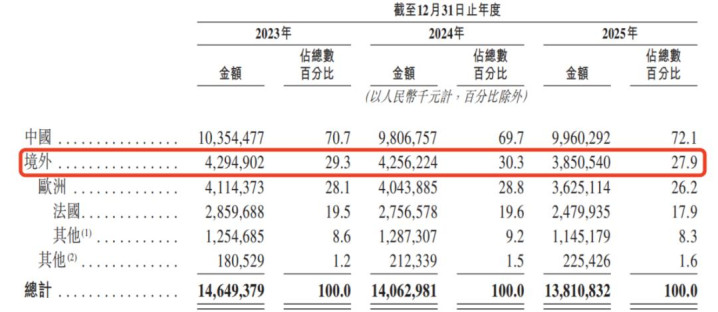 2023年及2025年,公司国外业务毛利率为40.1%、35.9%,低于国内业务毛利率41.1%、38%。