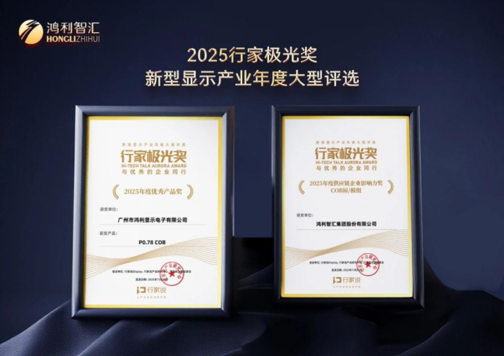 技术创新作为鸿利智汇发展的核心命脉,在2025年持续结出硕果。其中,鸿利智汇及旗下子公司鸿利显示在MiniLED领域的技术积淀与产品创新获得行业高度认可,先后斩获"2025年度供应链企业影响力奖(COB屏/模组)"和"2025年度优秀产品奖"两项重磅大奖,其推出的MiniLEDCOB解决方案覆盖多系列产品,点间距范围从P0.78延伸至P1.95,广泛适配租赁、户外显示及家庭影院等多元场景。
