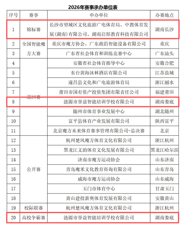 红网时代新闻2月16日讯(记者符洹雨)近日,国度体育总局棋牌畅通处罚中心发布《2026年中国魔方畅通赛事步履经办单元的告知》,晓喻将在湖南省长沙市、娄底市不竭举办中国魔方畅通锦标赛、中国魔方畅通巡回赛、中国魔方畅通高校争霸赛等赛事。其中,算作最高等异国度级赛事的2026年中国魔方畅通锦标赛,将在湖南省长沙市举行。