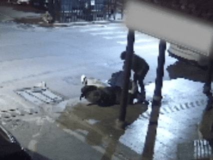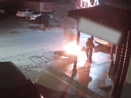 并对焚烧中的电动自行车握续拳打脚踢