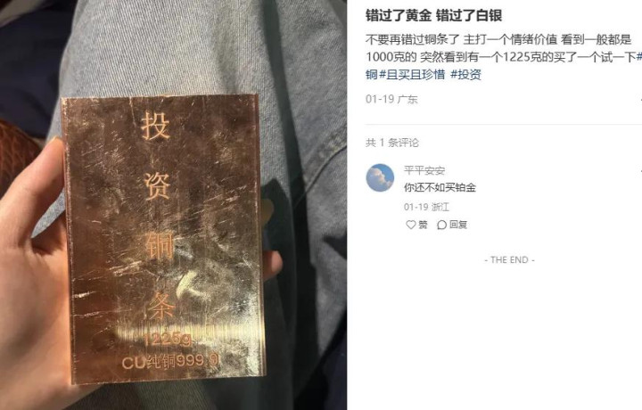 所以,对不是成吨成吨买的普通人来说,铜就不是什么高性价比的投资品,也不能充当金银的平替,出现这样的噱头产品,更多就是商家利用金银和有色金属价格上涨,去钻空子出的一个商品,满足大家想上车的情绪,主打一个情绪价值,大家也别真当投资品了。