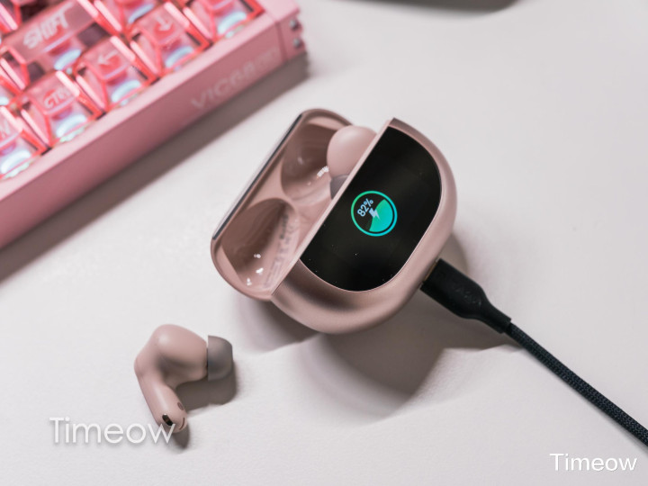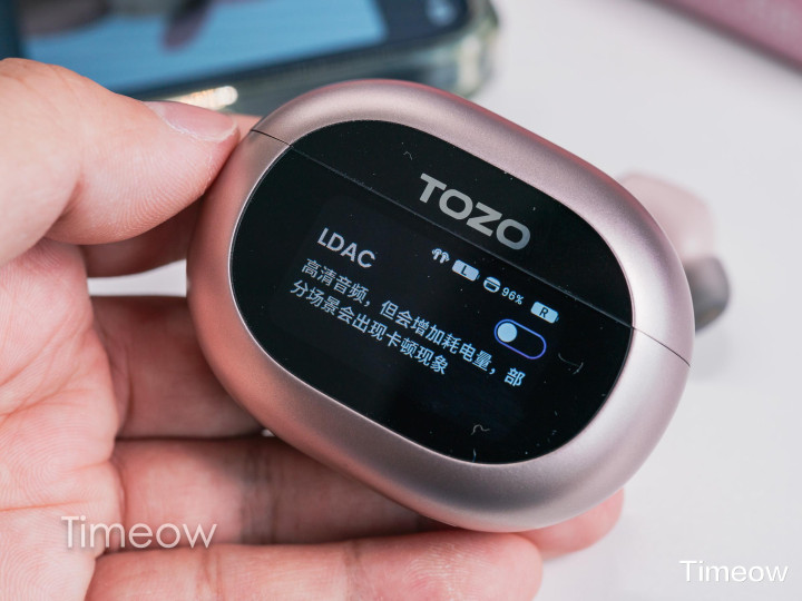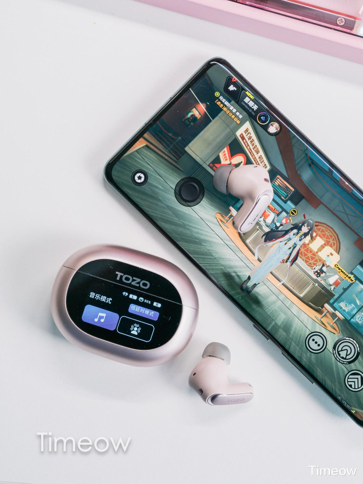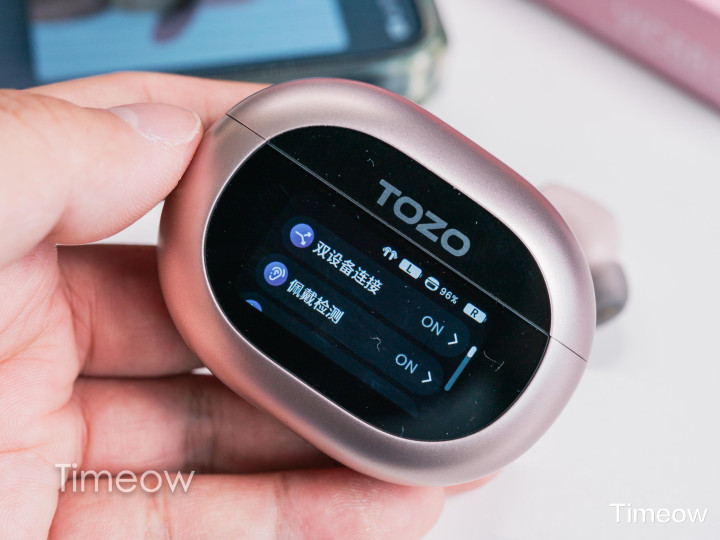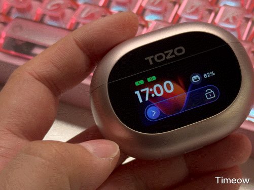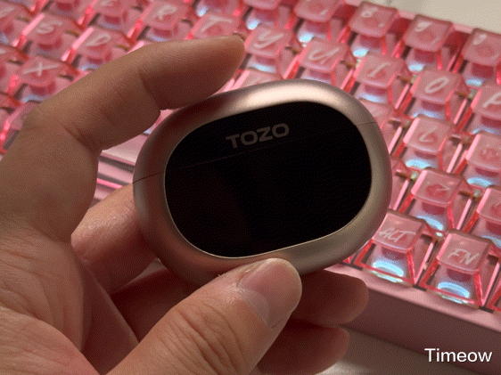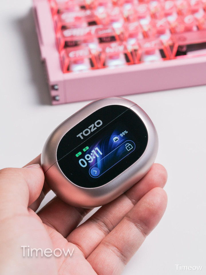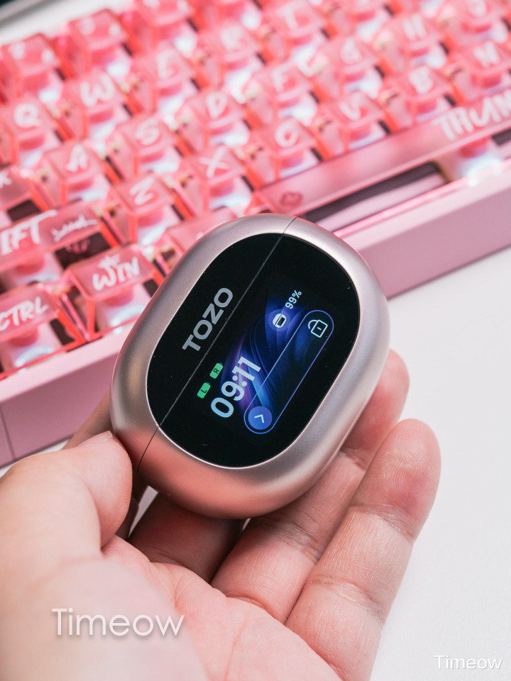 先看耳机盒野心,TOZO NC20 Pro 采纳了鹅卵石般的椭圆造型,名义袒护精细的磨砂材质,触感温润且不易沾染指纹,捏在掌心贴合度极高,平素放入口袋或背包完全不占地儿。更特真义的是,它的正面有一块LCD智能触控屏,无需拿脱手机就能完了多种操作,稍后我会聊。