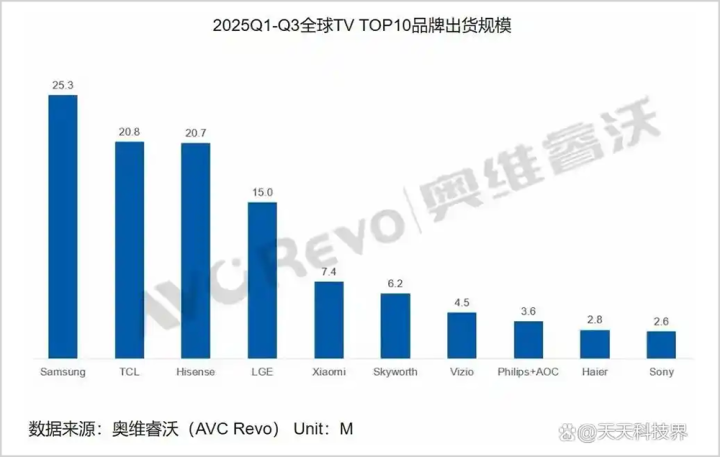 上世纪90年代,日本险些把握了大家90%以上的电视阛阓,其中,索尼一家就能占据超20%的蛋糕。而到2025年前三季度,日本仅有一家企业(索尼)能进入大家TOP10门槛。