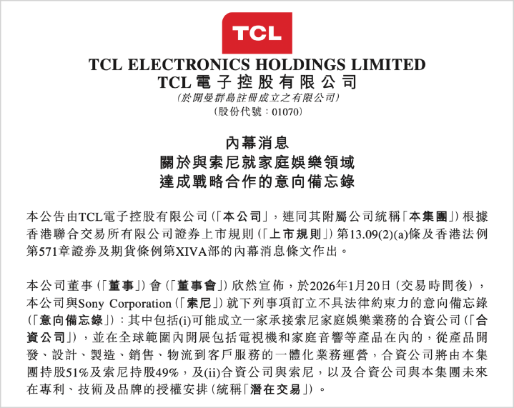 两者整合后,可将索尼留传的高品性画面和音频技能,以及大家高端品牌光环,和“TCL的先进自大技能、大家范围和垂直整合材干、端到端的资本后果等”相联接。