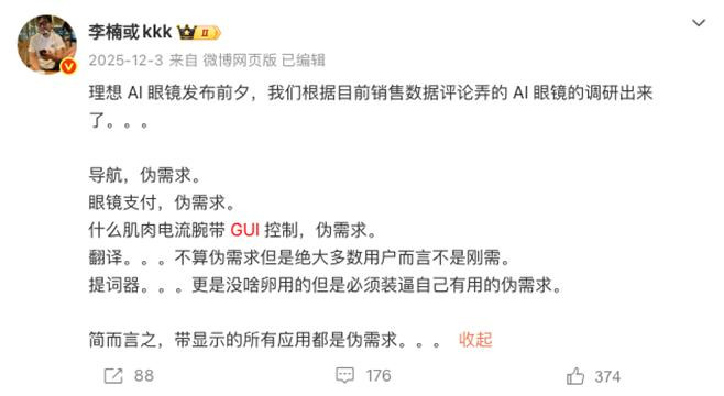 2025年12月,前魅族科技高档副总裁、Angry Miao独创东谈主李楠在应酬媒体平台露馅了把柄销售数据评述进行的AI眼镜调研,成果自大,导航、眼镜支付、肌肉电流腕带GUI轨则、翻译均为伪需求,“简而言之,带自大的所有欺诈齐是伪需求。”