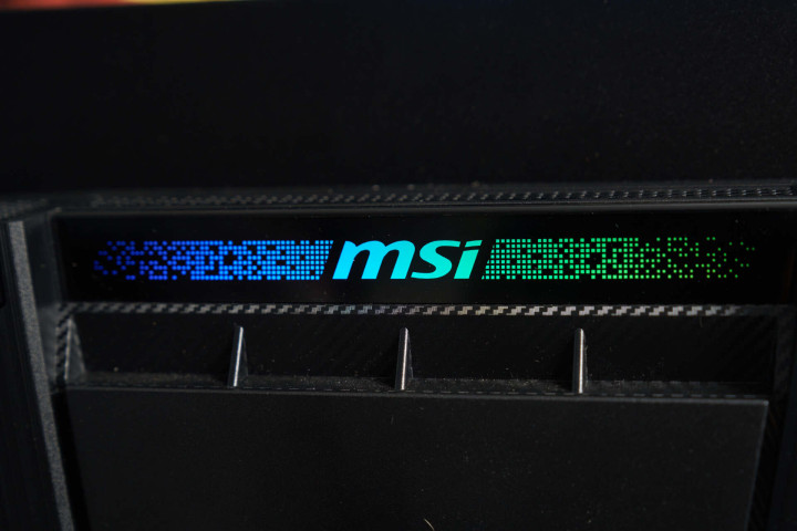 机身顶部配备了一块镌刻MSI 品牌符号的遮拦面板,该面板内置 ARGB 炫彩灯效模组,支捏通过MSI Center 软件进行灯效自界说与成立间同步联动。需要细心的是,罢了这一功能需将显露器与电脑主机通过 USB 线缆完成说合。