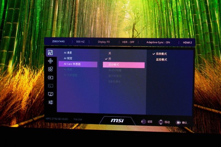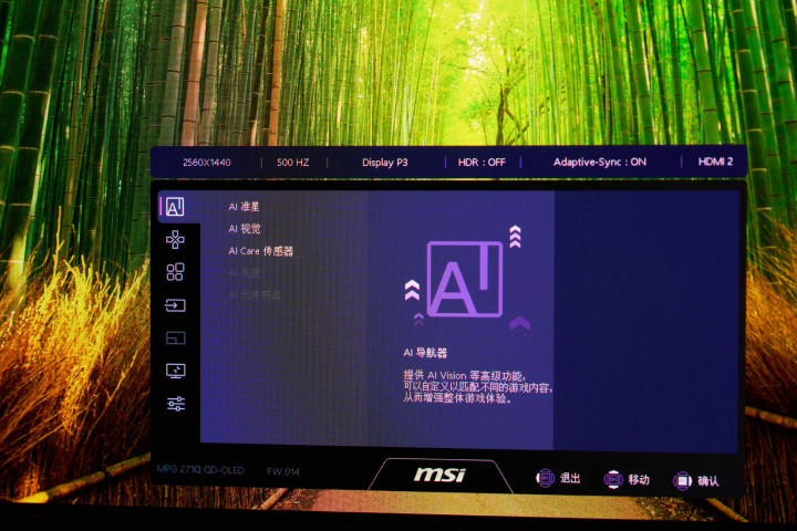 相较前代机型,微星 MPG 271QR QD-OLED X50 的 OSD 菜单进行了逻辑重构与功能升级,最直不雅的变化即是将AI 功能模块置顶为一级菜单,操作旅途更短、游戏与创作时的诞凯旋率大幅进步。