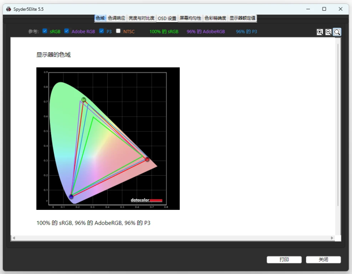 实测数据层面,借助红蜘蛛校色仪的专科检测,微星 MPG 271QR QD-OLED X50 显露器在默许用户形态下的色域施展异常亮眼:sRGB 色域罢了 100% 全掩盖,AdobeRGB 与 DCI-P3 色域掩盖度也别离达到 96%,实测数据与官方标称值基本吻合,充分印证了其专科级的色调掩盖能力。
