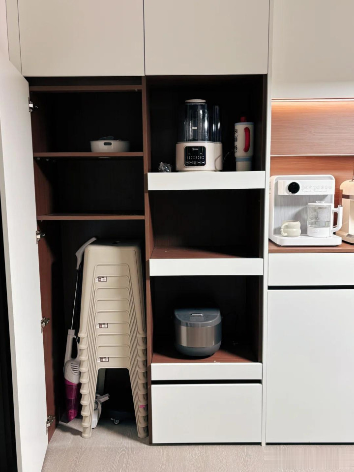 厨房中普通使用平凡的小电器,亦然需要咱们在装修研究时,提前商量好的收纳需求,否则厨房台面上,经久都会堆积着乱糟糟的厨房小电器。