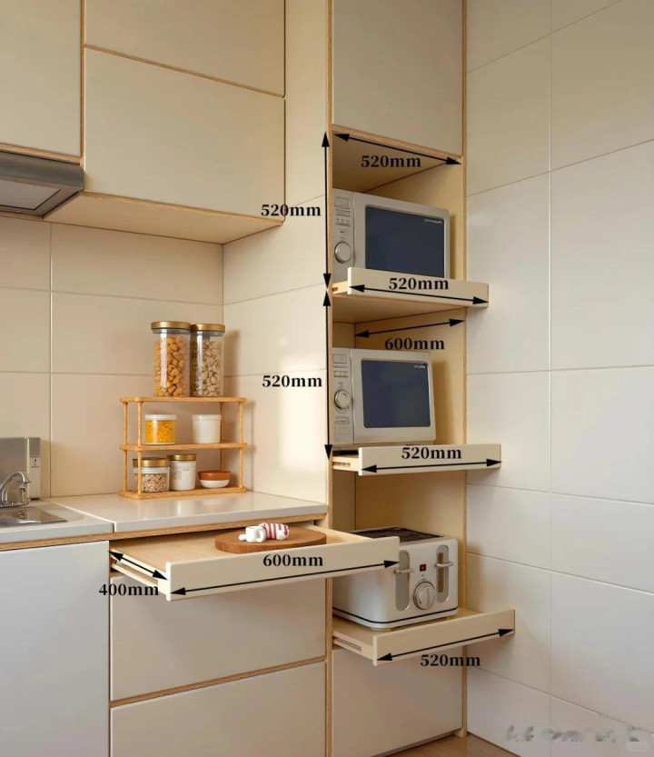 惩处的方式也很是的毛糙,只需要在研究厨房时,计齐整组盛开式的抽拉式收纳柜,即可满足,普通关于厨房小家电的收纳需求。