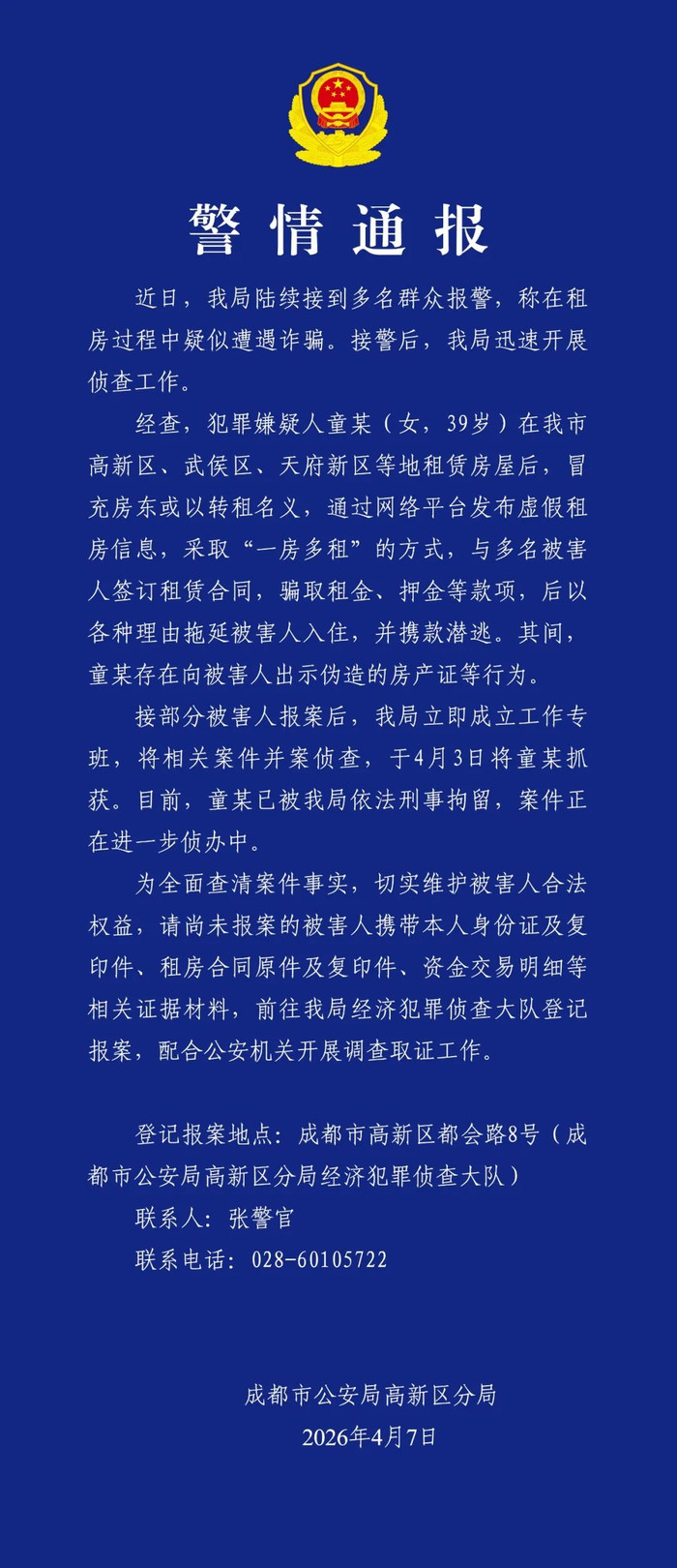 可提现游戏平台app 成齐警方通报:童某(女,39岁)被执获,请被害东谈主速来报案