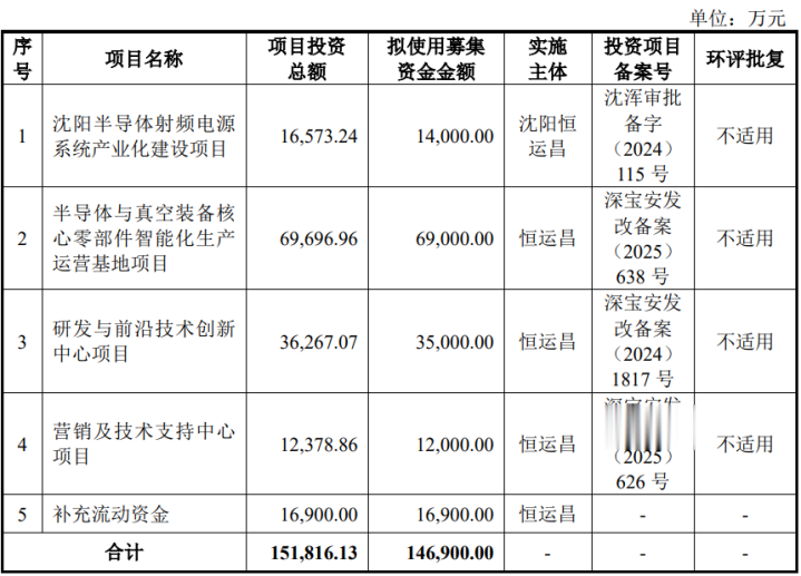 招股书显示,恒运昌此次IPO拟募集资金14.69亿元用于沈阳半导体射频电源系统产业化建设项目、半导体与真空装备核心零部件智能化生产运营基地项目、研发与前沿技术创新中心项目、营销及技术支持中心项目的建设,以及补充流动资金。