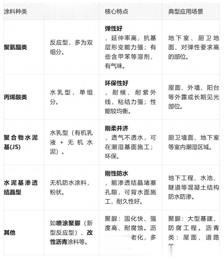 以下表格整理了市集上主流的几类防水涂料相称中枢特色,肤浅你快速对比: