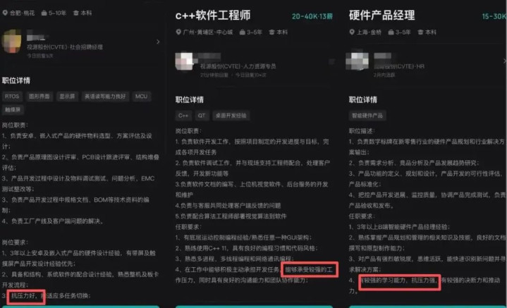 在BOSS直聘等多个招聘平台夸耀,视源股份招聘的高档软件工程师、显控硬件工程师等多个中枢岗亭,均在职职条目中注明“需承受较大职责压力”“抗压力强”。