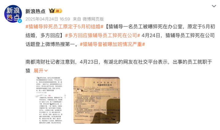 2025年4月,猿指引武汉分公司曾经发生职工加班暴毙事件激勉了热议;值得一提的是,这位职工原定于5月初成亲。