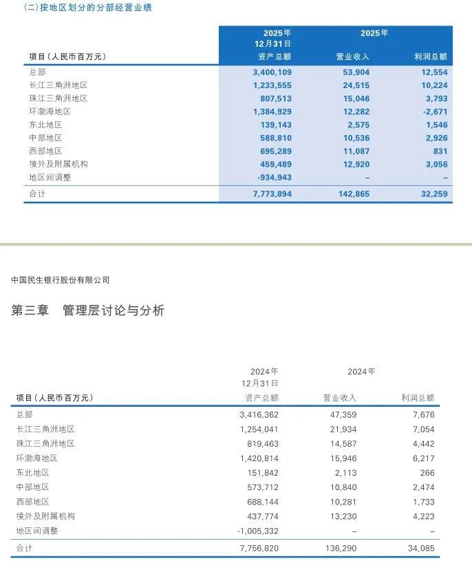 2025年,民生银行在环渤海地区的交易收入为122.82亿元,同比下跌22.98%;利润总数为-26.71亿元,同比下跌142.96%,由盈转亏。