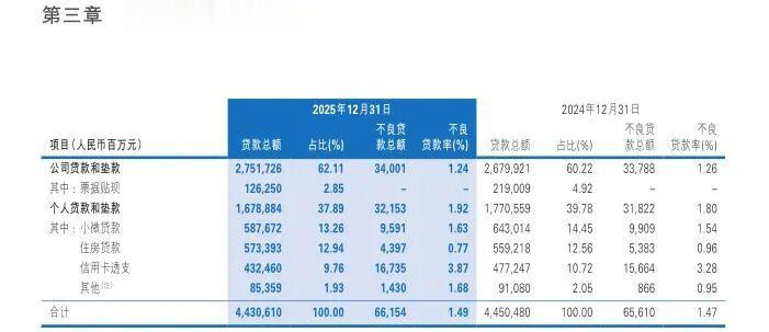 黄桷树pro介怀到,民生银行2025年年报明确指出“不良贷款生成率为1.56%,同比飞腾0.07个百分点,主若是零卖类贷款更生成不良有所加多”——这显露合座信贷金钱质地恶化,具体来看,小微贷款不良率从1.54%飞腾至1.63%,信用卡透支不良率从3.28%飞腾至3.87%。
