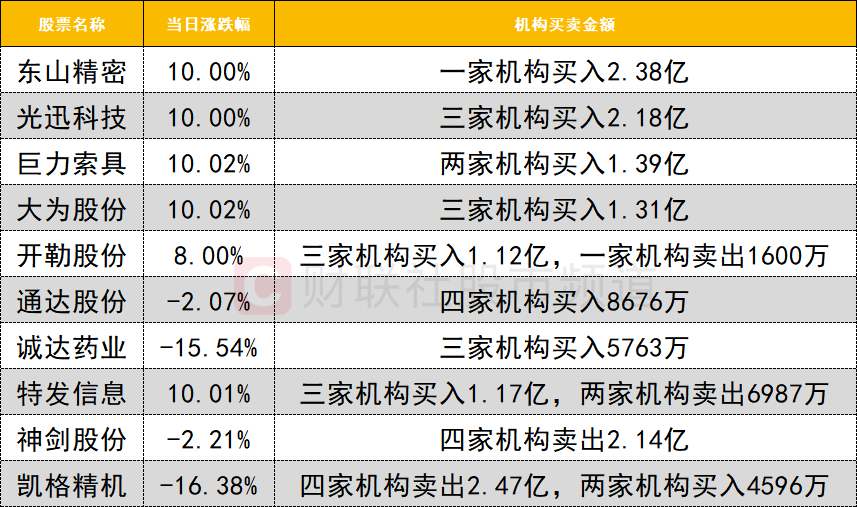 一线游资活跃度较高,光迅科技获一家游资(国泰海通证券武汉紫阳东路)买入2.51亿。东山精密走出2连板,续创历史新高,获一家游资(国泰海通证券上海中山东路)买入1.84亿。