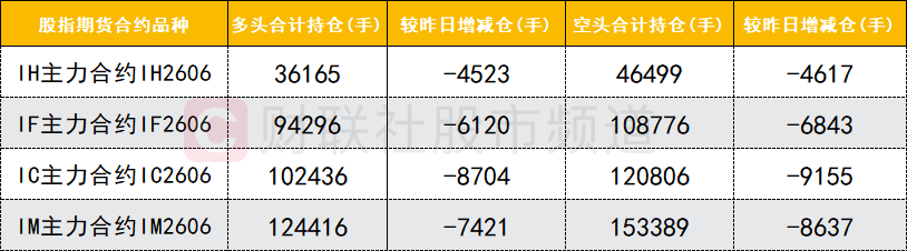 四大期指主力合约中,IH、IF、IC、IM合约多空两边均减仓,IC、IM合约空头减仓数目较多。