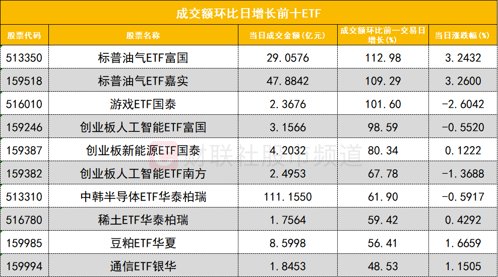 从成交额环比增长前十的ETF来看,标普油气ETF富国(513350)成交额环比增长112%位居首位;标普油气ETF嘉实(159518)成交额环比增长109%位居次席。