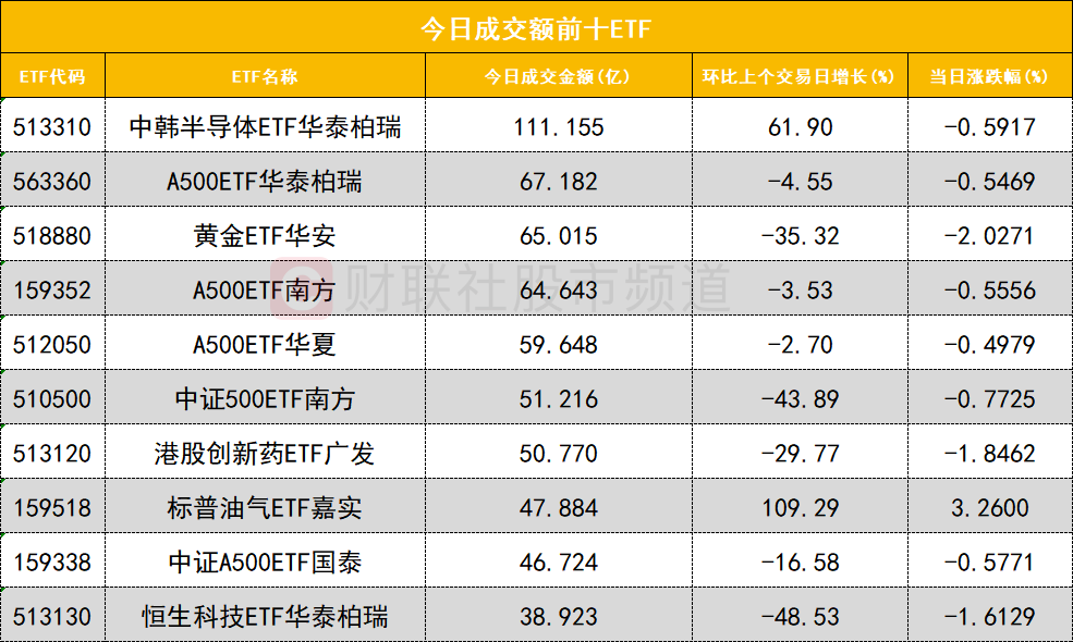 从成交额前十的ETF来看,中韩半导体ETF华泰柏瑞(513310)成交额位居首位,A500ETF华泰柏瑞(563360)成交额位居次席。