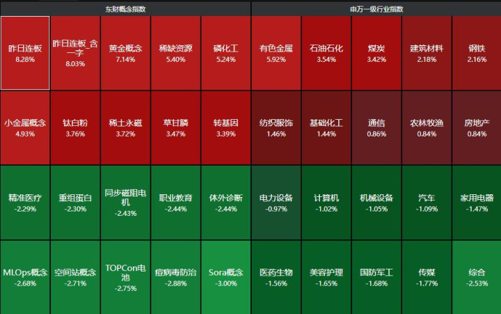 分行业来看,有色金属、石油石化、煤炭、建筑材料、钢铁等行业领涨,综合、传媒、国防军工、美容护理、医药生物等行业领跌。