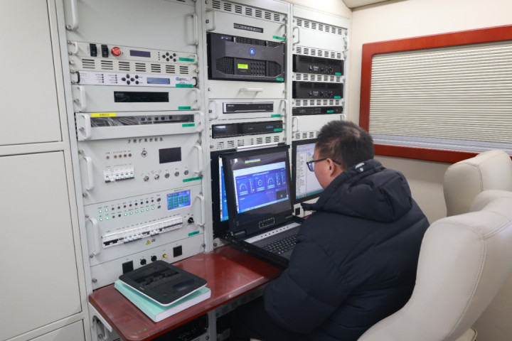 合肥市表象局业务东说念主员在济急保险车内实时监测天气情况。