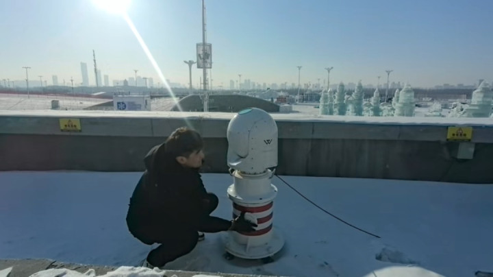 哈尔滨市表象局责任主说念主员巡检注重春晚哈尔滨分会场冰雪大世界园区内的激光测风雷达。影相:矫玲玲