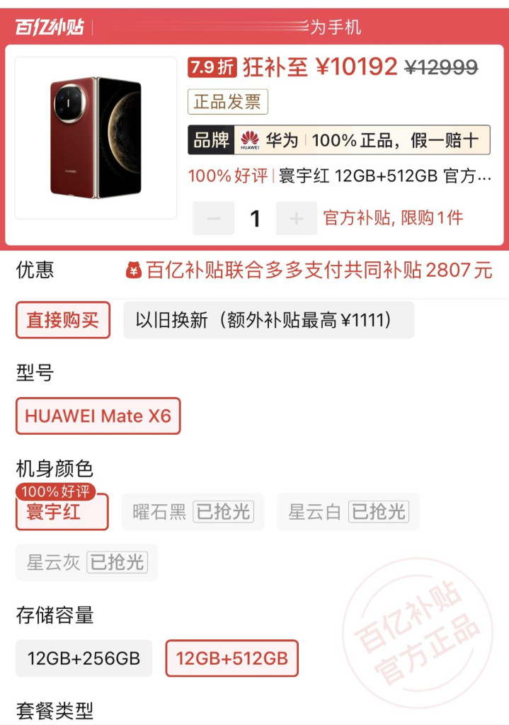 总的来说,就华为Mate X6这款折叠屏手机,并不是那种“看参数就满腔温煦”的产物,它更像是一部把每个细节都打磨到位的熟谙折叠屏旗舰,它守护的是“折叠屏能不可当主力机”的问题,而不是“能不可炫技”!若是你思要一部外不雅有辨识度、屏幕体验出色、影像可靠、通讯宽心,同期又弥散浮滑耐用的折叠屏手机,就华为这款产物如故很值得来源的,而就在价钱层面如今所出现的下调情况亦然很严重的,参考到如今电商平台中的售价情况,其中512GB的内存规格依然出现了3807元的下调幅度了。