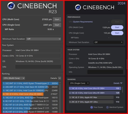 其实从R23和2024单核和多核测试来看,酷睿UltraX9388H惩处器与上一代酷睿Ultra9285H作念对比的话(R23单核2015、多核21403,2024单核121,多核1147),照旧达成了全面超越。