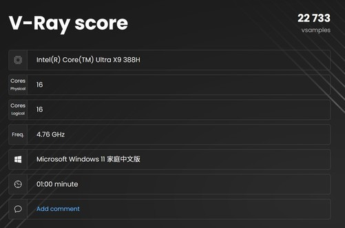 酷睿UltraX9388H惩处器在V-RayBenchmark测试范例下,一分钟采样率为22733vsamples,Corona10Benchmark色泽渲染速率可以达到7093796rays/s,而BlenderBenchmark的monster、junkshop和classroom三项测试中,1分钟采样率阔别为138.94、95.76以及68.8samples,举座渲染性能较上一代也有比较显耀的普及。