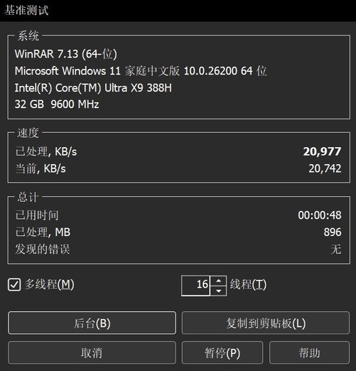 WinRAR压缩/解压缩基准惩处速率平均达到了20977KB/s,16线程带来的性能普及照旧比较昭着的。