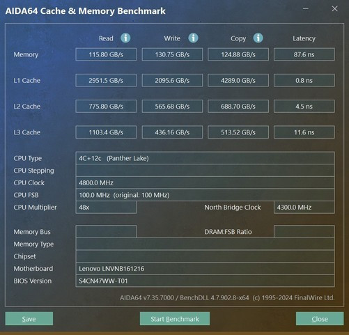 从AIDA64内存性能测试来看,读取速率达到了115.8GB/s,写入速率130.75GB/s,拷贝速率124.88GB/s,这意味着从PantherLake启动,移动级平台的内存性能全面毁坏百GB/s速率大关。而且更为让东谈主只怕的是,内存蔓延降到了87.6ns,这可以说是尽头大的越过。因为此前几代惩处器平台在内存蔓延上大批超越了100ns,PantherLake内存蔓延下落到87.6ns可以说辱骂常大的越过,在面对游戏等内存明锐型哄骗上,更低的蔓延天然会带来更好的体验。