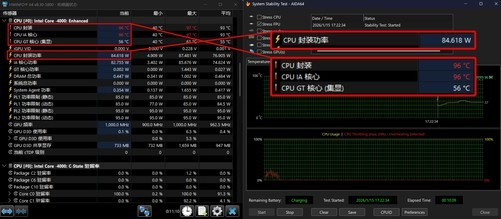 当先AIDA64FPUCPU单拷机测试,CPU功耗富厚85W开释,CPU封装温度96℃,进展良好。