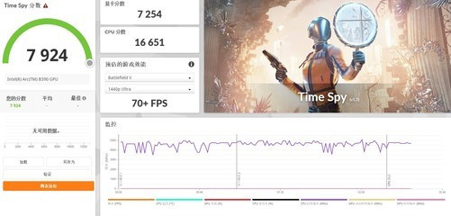 咱们先来通过3DMark表面测试望望锐炫B390的图形性能进展。在TimeSpyDX12测试范例下,B390图形性能评分达到了7254分,这个性能其实比较接近此前65W超低功耗的RTX4060独显的性能水准。另外SteelNomadLight测试得分6283分,在集成显卡里确乎是有着天花板级别的图形性能进展。