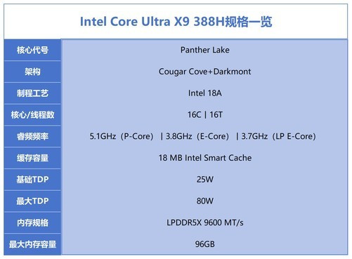 英特尔PantherLake家眷首发包含14款不同规格的SKU,最高型号为英特尔酷睿UltraX9388H和酷睿Ultra9386H,前者是咱们今天评测的主角。16中枢16线程的CPU带来更强的臆测才气,50TOPS算力的NPU臆测单位不竭以低功耗赋能AI哄骗,而大放异彩的Xe3架构锐炫B390核显凭借12个Xe中枢带来的强劲图形性能与120TOPS的AI算力升级,随性遮掩游戏、创作到AI哄骗到全场景哄骗需求。