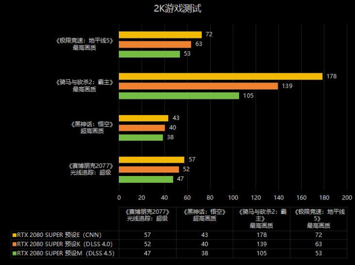 4K分辨率咱们只测试了RTX 2080 SUPER显卡,在《赛博一又克2077》中,DLSS 4.5的帧率比CNN模子高约16%,《黑外传:悟空》和CNN模子抓平。另外两款游戏的平均帧率辨认下跌了约33%和18%。