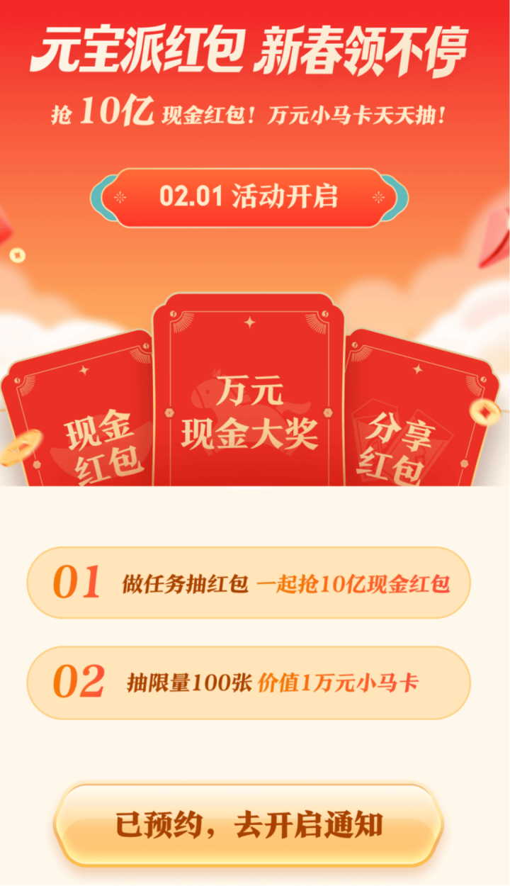 {jz:field.toptypename/}2月1日在元宝App上线春节红包步履,用户可参与共享10亿元现款。
