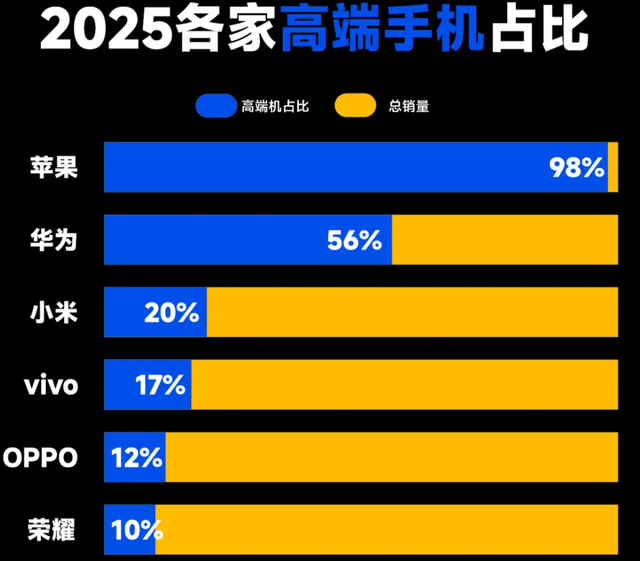 其实苹果的高端机占比高达98%,然后是华为,比例为56%,再是小米为20%,VIVO为17%,OPPO为12%,荣耀为10%。